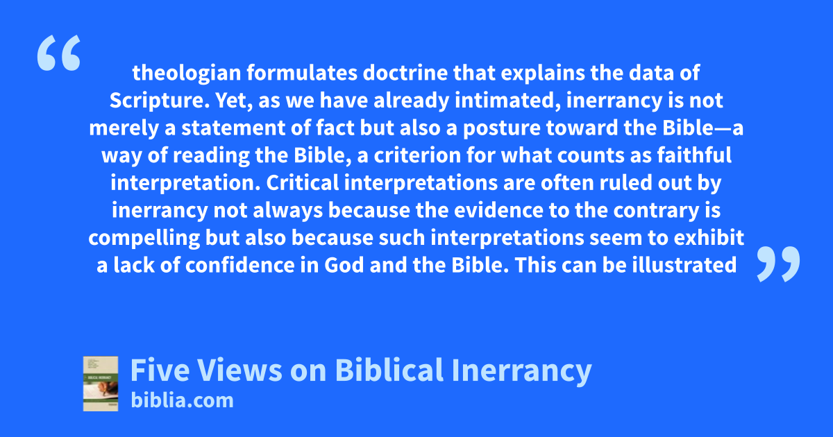 theologian formulates doctrine that explains the data of Scripture. Yet, as we have already intimated, inerrancy is not merely a statement of fact but also a posture toward the Bible—a way of reading the Bible, a criterion for what counts as faithful interpretation. Critical interpretations are often ruled out by inerrancy not always because the evidence to the contrary is compelling but also because such interpretations seem to exhibit a lack of confidence in God and the Bible. This can be illustrated