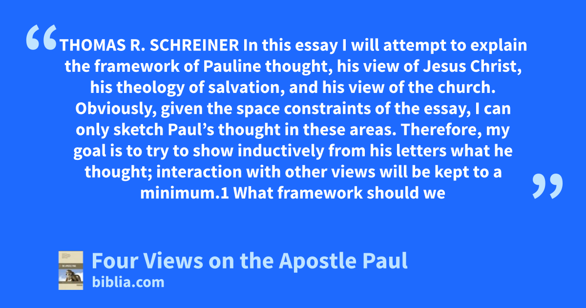 THOMAS R. SCHREINER In this essay I will attempt to explain the framework of Pauline thought, his view of Jesus Christ, his theology of salvation, and his view of the church. Obviously, given the space constraints of the essay, I can only sketch Paul’s thought in these areas. Therefore, my goal is to try to show inductively from his letters what he thought; interaction with other views will be kept to a minimum.1 What framework should we