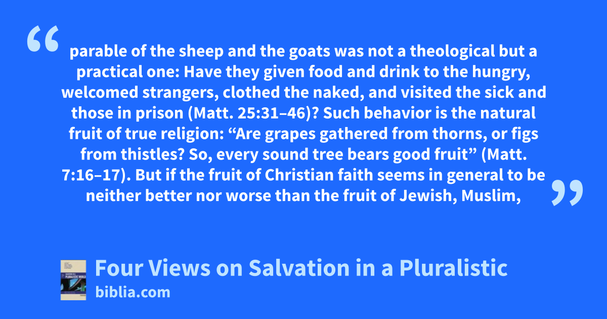 parable of the sheep and the goats was not a theological but a practical one: Have they given food and drink to the hungry, welcomed strangers, clothed the naked, and visited the sick and those in prison (Matt. 25:31–46)? Such behavior is the natural fruit of true religion: “Are grapes gathered from thorns, or figs from thistles? So, every sound tree bears good fruit” (Matt. 7:16–17). But if the fruit of Christian faith seems in general to be neither better nor worse than the fruit of Jewish, Muslim,