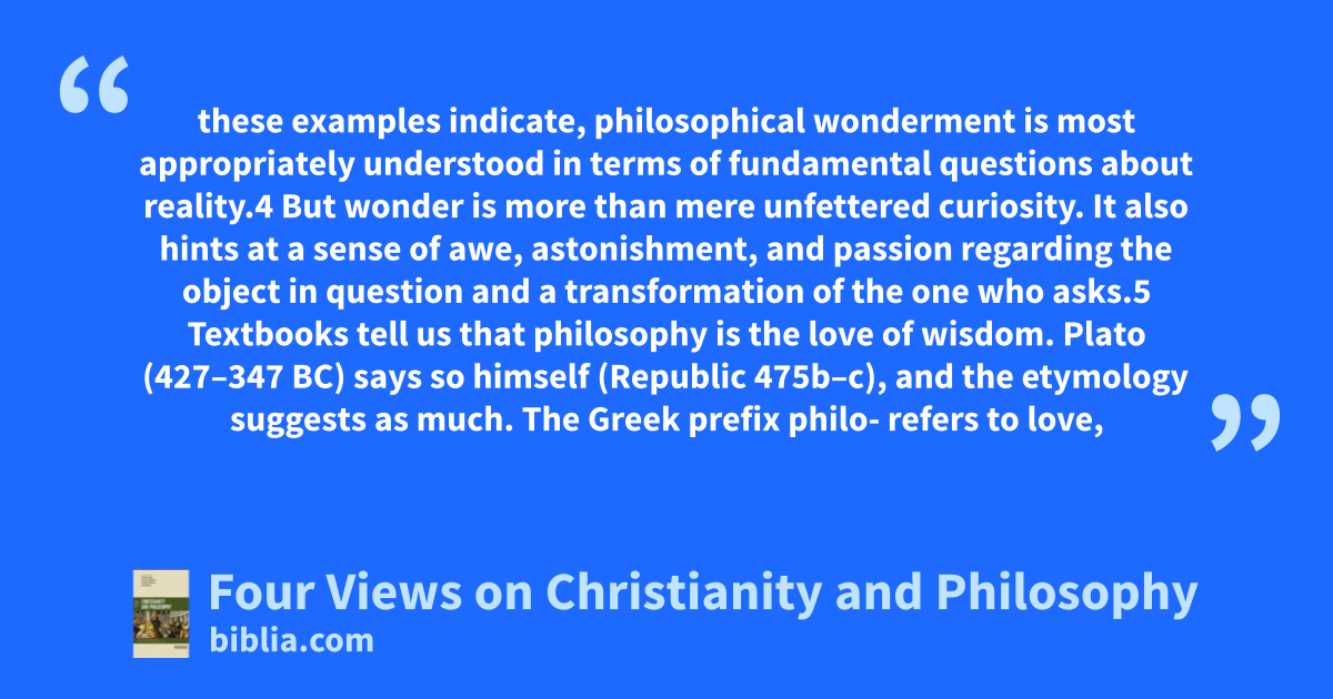 these examples indicate, philosophical wonderment is most appropriately understood in terms of fundamental questions about reality.4 But wonder is more than mere unfettered curiosity. It also hints at a sense of awe, astonishment, and passion regarding the object in question and a transformation of the one who asks.5 Textbooks tell us that philosophy is the love of wisdom. Plato (427–347 BC) says so himself (Republic 475b–c), and the etymology suggests as much. The Greek prefix philo- refers to love,