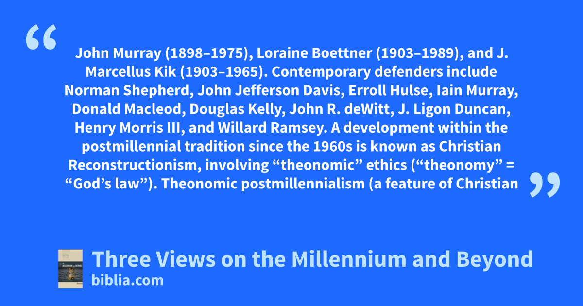 John Murray (1898–1975), Loraine Boettner (1903–1989), and J. Marcellus Kik (1903–1965). Contemporary defenders include Norman Shepherd, John Jefferson Davis, Erroll Hulse, Iain Murray, Donald Macleod, Douglas Kelly, John R. deWitt, J. Ligon Duncan, Henry Morris III, and Willard Ramsey. A development within the postmillennial tradition since the 1960s is known as Christian Reconstructionism, involving “theonomic” ethics (“theonomy” = “God’s law”). Theonomic postmillennialism (a feature of Christian