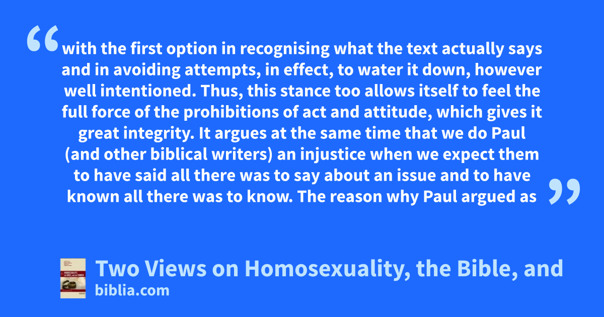 with the first option in recognising what the text actually says and in avoiding attempts, in effect, to water it down, however well intentioned. Thus, this stance too allows itself to feel the full force of the prohibitions of act and attitude, which gives it great integrity. It argues at the same time that we do Paul (and other biblical writers) an injustice when we expect them to have said all there was to say about an issue and to have known all there was to know. The reason why Paul argued as