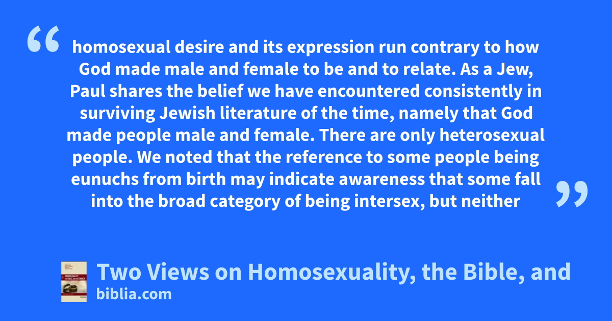 homosexual desire and its expression run contrary to how God made male and female to be and to relate. As a Jew, Paul shares the belief we have encountered consistently in surviving Jewish literature of the time, namely that God made people male and female. There are only heterosexual people. We noted that the reference to some people being eunuchs from birth may indicate awareness that some fall into the broad category of being intersex, but neither