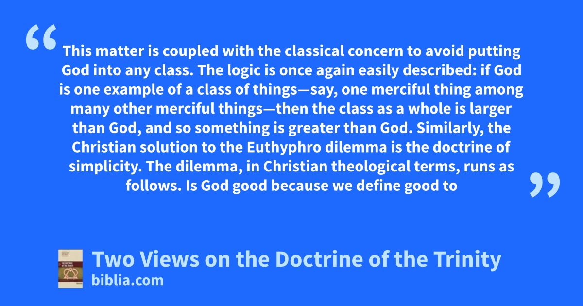 This matter is coupled with the classical concern to avoid putting God into any class. The logic is once again easily described: if God is one example of a class of things—say, one merciful thing among many other merciful things—then the class as a whole is larger than God, and so something is greater than God. Similarly, the Christian solution to the Euthyphro dilemma is the doctrine of simplicity. The dilemma, in Christian theological terms, runs as follows. Is God good because we define good to