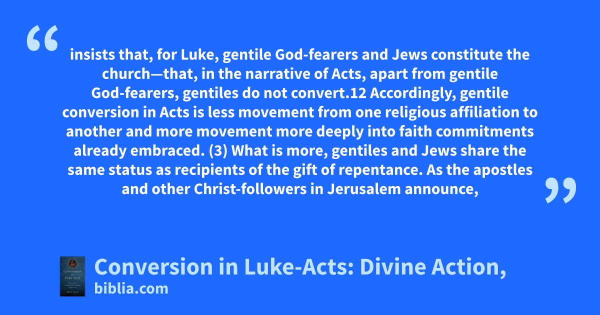 insists that, for Luke, gentile God-fearers and Jews constitute the church—that, in the narrative of Acts, apart from gentile God-fearers, gentiles do not convert.12 Accordingly, gentile conversion in Acts is less movement from one religious affiliation to another and more movement more deeply into faith commitments already embraced. (3) What is more, gentiles and Jews share the same status as recipients of the gift of repentance. As the apostles and other Christ-followers in Jerusalem announce,