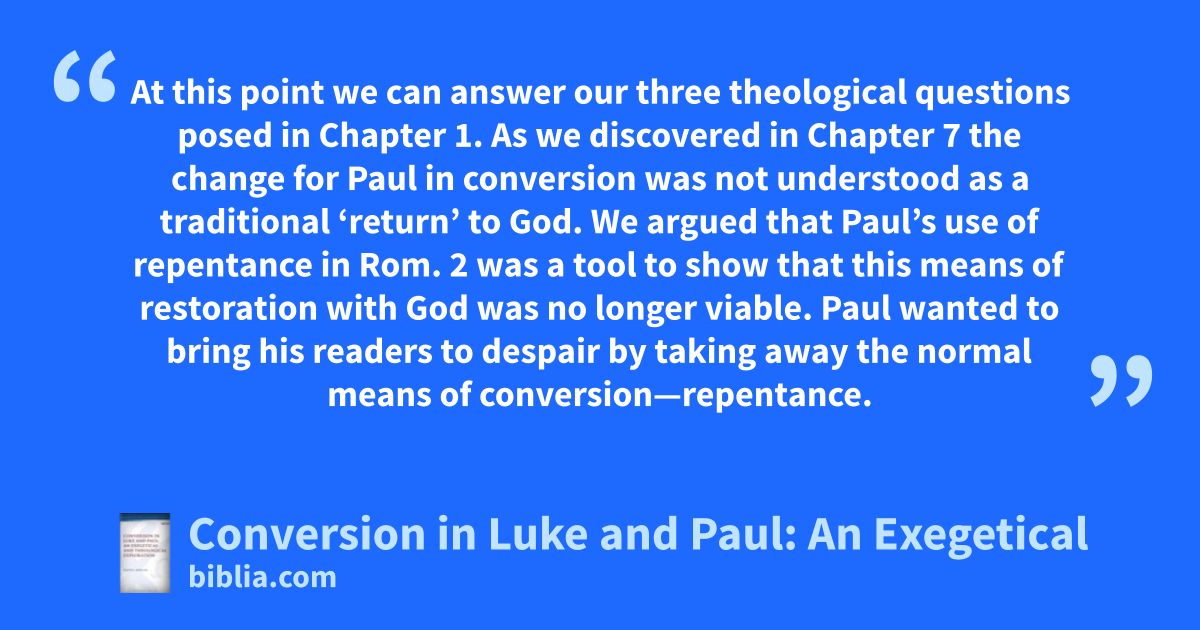 At this point we can answer our three theological questions posed in Chapter 1. As we discovered in Chapter 7 the change for Paul in conversion was not understood as a traditional ‘return’ to God. We argued that Paul’s use of repentance in Rom. 2 was a tool to show that this means of restoration with God was no longer viable. Paul wanted to bring his readers to despair by taking away the normal means of conversion—repentance.