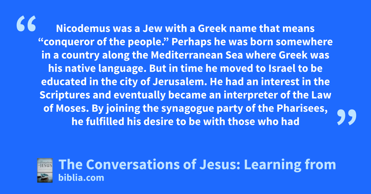 Nicodemus was a Jew with a Greek name that means “conqueror of the people.” Perhaps he was born somewhere in a country along the Mediterranean Sea where Greek was his native language. But in time he moved to Israel to be educated in the city of Jerusalem. He had an interest in the Scriptures and eventually became an interpreter of the Law of Moses. By joining the synagogue party of the Pharisees, he fulfilled his desire to be with those who had
