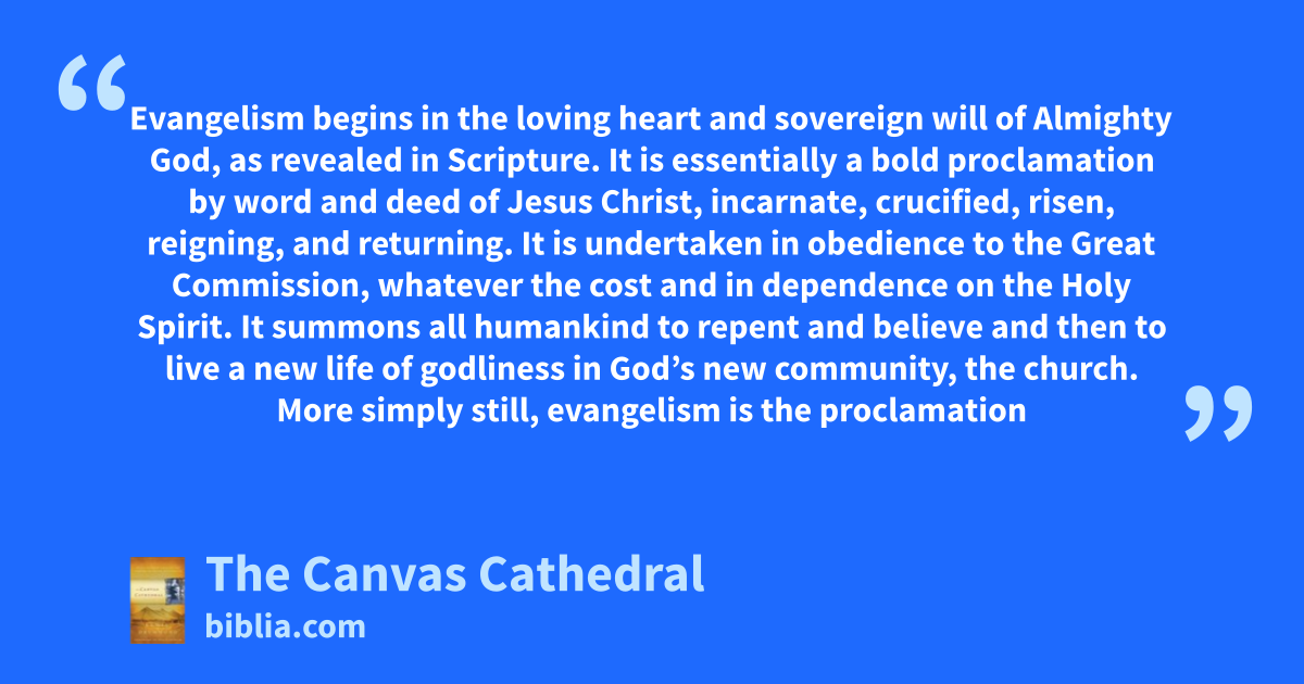 Evangelism begins in the loving heart and sovereign will of Almighty God, as revealed in Scripture. It is essentially a bold proclamation by word and deed of Jesus Christ, incarnate, crucified, risen, reigning, and returning. It is undertaken in obedience to the Great Commission, whatever the cost and in dependence on the Holy Spirit. It summons all humankind to repent and believe and then to live a new life of godliness in God’s new community, the church. More simply still, evangelism is the proclamation