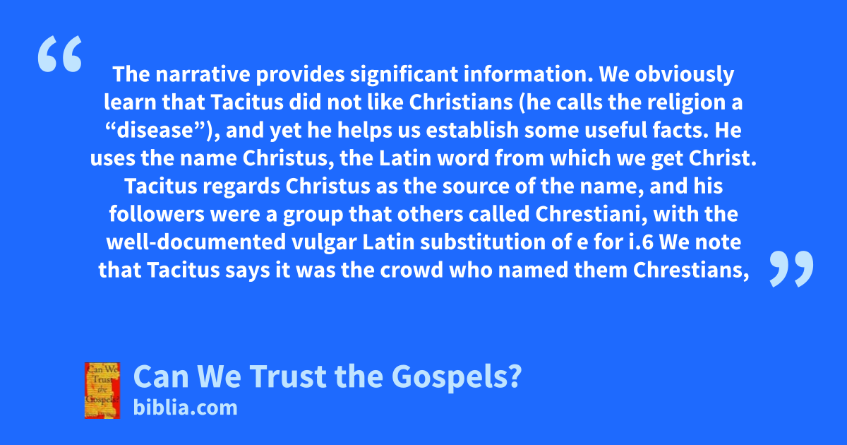 The narrative provides significant information. We obviously learn that Tacitus did not like Christians (he calls the religion a “disease”), and yet he helps us establish some useful facts. He uses the name Christus, the Latin word from which we get Christ. Tacitus regards Christus as the source of the name, and his followers were a group that others called Chrestiani, with the well-documented vulgar Latin substitution of e for i.6 We note that Tacitus says it was the crowd who named them Chrestians,