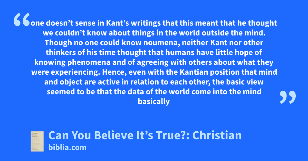 one doesn’t sense in Kant’s writings that this meant that he thought we couldn’t know about things in the world outside the mind. Though no one could know noumena, neither Kant nor other thinkers of his time thought that humans have little hope of knowing phenomena and of agreeing with others about what they were experiencing. Hence, even with the Kantian position that mind and object are active in relation to each other, the basic view seemed to be that the data of the world come into the mind basically