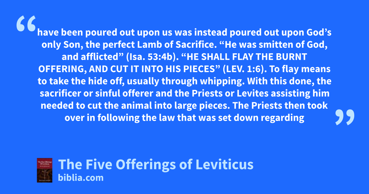 have been poured out upon us was instead poured out upon God’s only Son, the perfect Lamb of Sacrifice. “He was smitten of God, and afflicted” (Isa. 53:4b). “HE SHALL FLAY THE BURNT OFFERING, AND CUT IT INTO HIS PIECES” (LEV. 1:6). To flay means to take the hide off, usually through whipping. With this done, the sacrificer or sinful offerer and the Priests or Levites assisting him needed to cut the animal into large pieces. The Priests then took over in following the law that was set down regarding