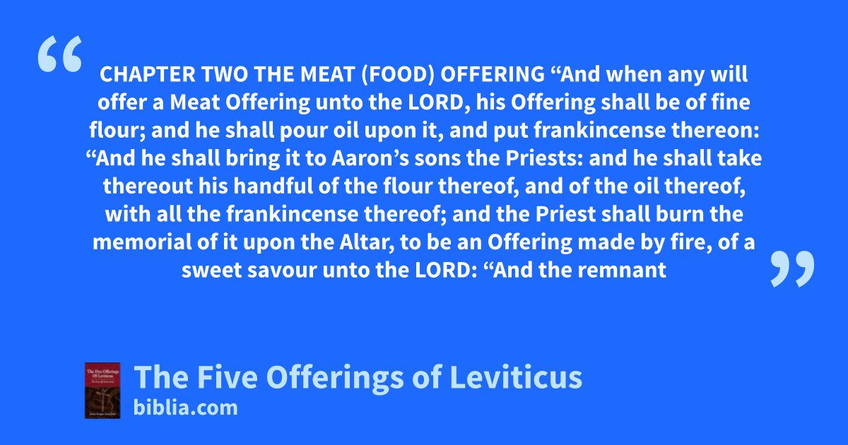 CHAPTER TWO THE MEAT (FOOD) OFFERING “And when any will offer a Meat Offering unto the LORD, his Offering shall be of fine flour; and he shall pour oil upon it, and put frankincense thereon: “And he shall bring it to Aaron’s sons the Priests: and he shall take thereout his handful of the flour thereof, and of the oil thereof, with all the frankincense thereof; and the Priest shall burn the memorial of it upon the Altar, to be an Offering made by fire, of a sweet savour unto the LORD: “And the remnant