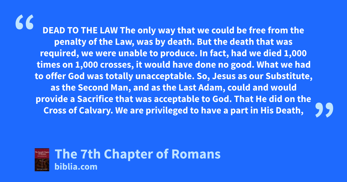DEAD TO THE LAW The only way that we could be free from the penalty of the Law, was by death. But the death that was required, we were unable to produce. In fact, had we died 1,000 times on 1,000 crosses, it would have done no good. What we had to offer God was totally unacceptable. So, Jesus as our Substitute, as the Second Man, and as the Last Adam, could and would provide a Sacrifice that was acceptable to God. That He did on the Cross of Calvary. We are privileged to have a part in His Death,
