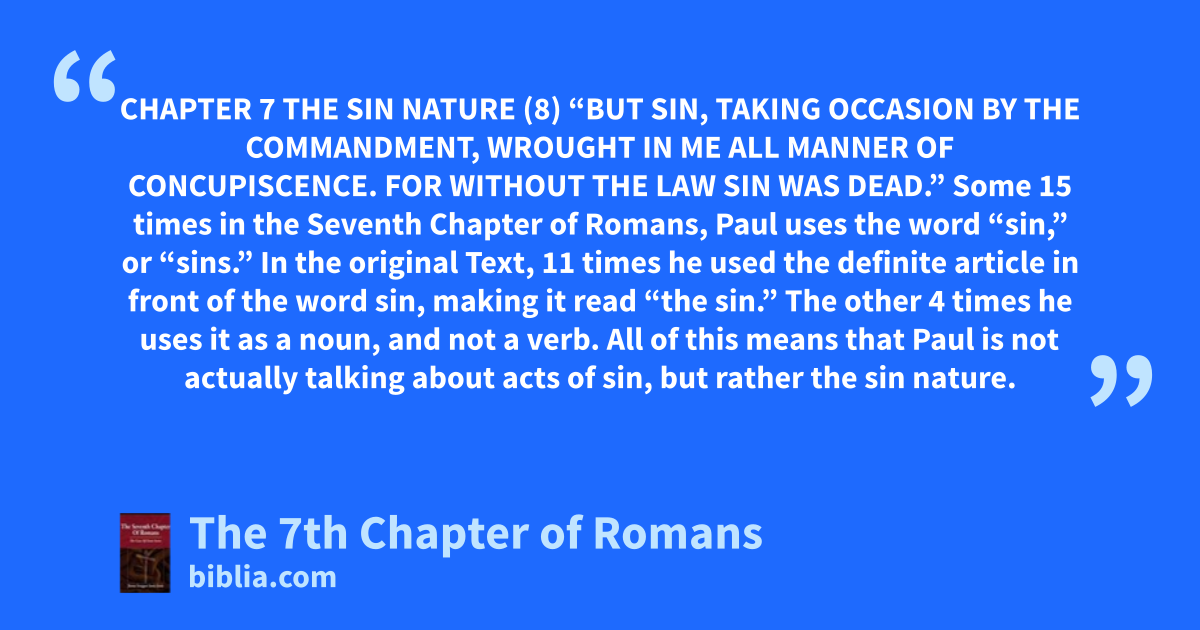 CHAPTER 7 THE SIN NATURE (8) “BUT SIN, TAKING OCCASION BY THE COMMANDMENT, WROUGHT IN ME ALL MANNER OF CONCUPISCENCE. FOR WITHOUT THE LAW SIN WAS DEAD.” Some 15 times in the Seventh Chapter of Romans, Paul uses the word “sin,” or “sins.” In the original Text, 11 times he used the definite article in front of the word sin, making it read “the sin.” The other 4 times he uses it as a noun, and not a verb. All of this means that Paul is not actually talking about acts of sin, but rather the sin nature.