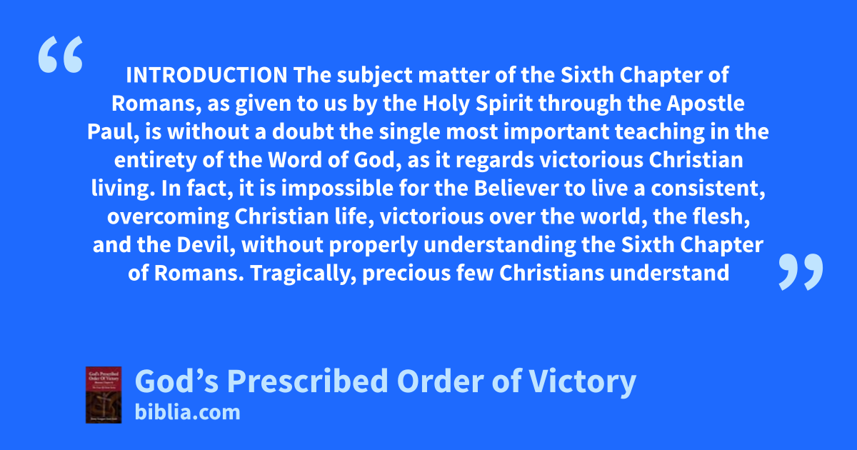 INTRODUCTION The subject matter of the Sixth Chapter of Romans, as given to us by the Holy Spirit through the Apostle Paul, is without a doubt the single most important teaching in the entirety of the Word of God, as it regards victorious Christian living. In fact, it is impossible for the Believer to live a consistent, overcoming Christian life, victorious over the world, the flesh, and the Devil, without properly understanding the Sixth Chapter of Romans. Tragically, precious few Christians understand