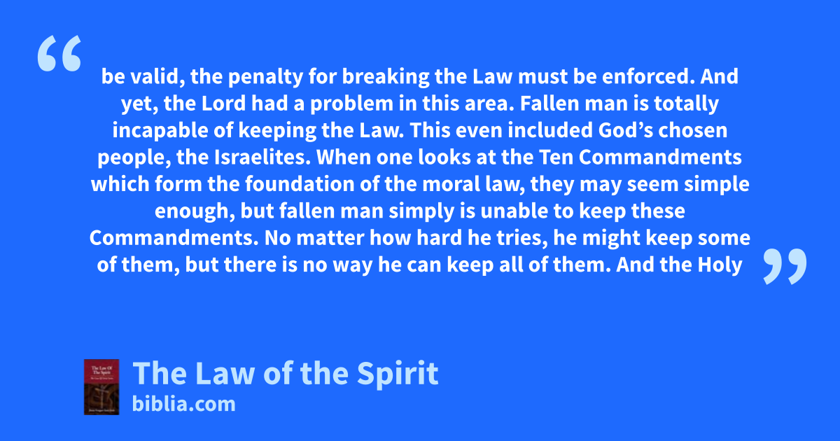 be valid, the penalty for breaking the Law must be enforced. And yet, the Lord had a problem in this area. Fallen man is totally incapable of keeping the Law. This even included God’s chosen people, the Israelites. When one looks at the Ten Commandments which form the foundation of the moral law, they may seem simple enough, but fallen man simply is unable to keep these Commandments. No matter how hard he tries, he might keep some of them, but there is no way he can keep all of them. And the Holy