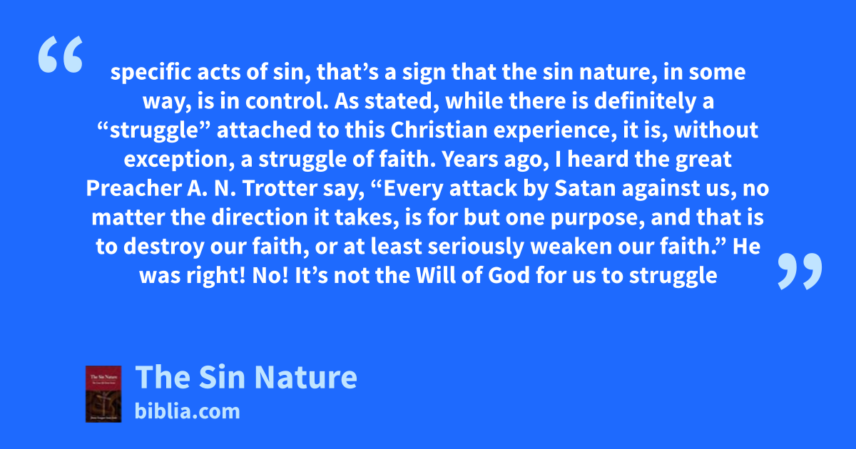 specific acts of sin, that’s a sign that the sin nature, in some way, is in control. As stated, while there is definitely a “struggle” attached to this Christian experience, it is, without exception, a struggle of faith. Years ago, I heard the great Preacher A. N. Trotter say, “Every attack by Satan against us, no matter the direction it takes, is for but one purpose, and that is to destroy our faith, or at least seriously weaken our faith.” He was right! No! It’s not the Will of God for us to struggle