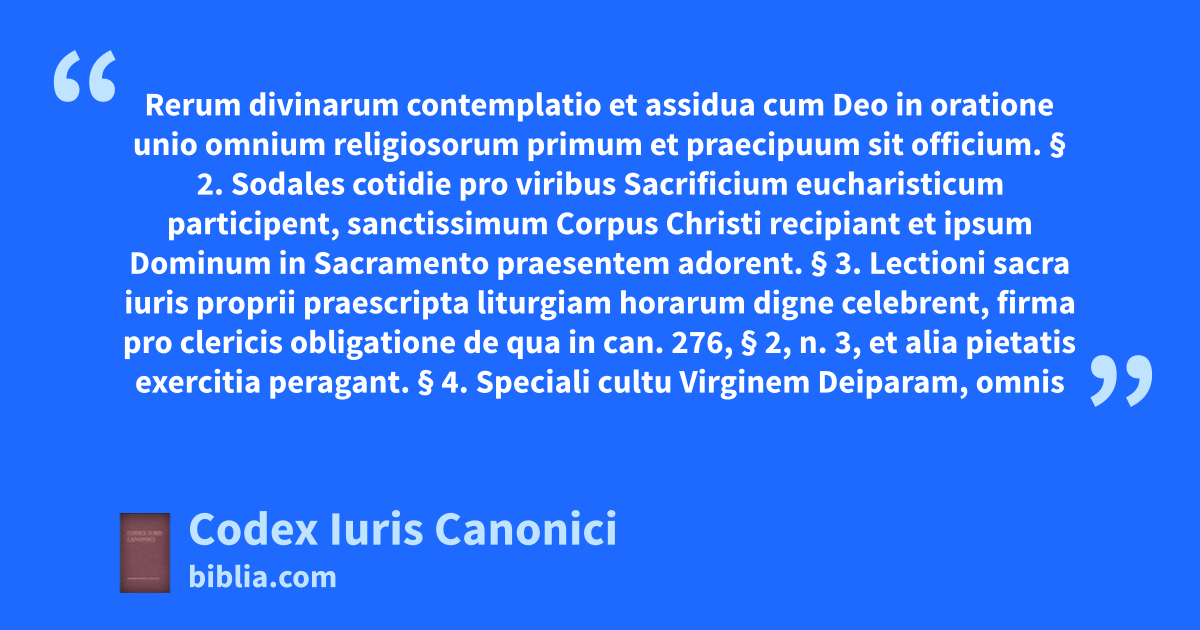 Rerum divinarum contemplatio et assidua cum Deo in oratione unio omnium religiosorum primum et praecipuum sit officium. § 2. Sodales cotidie pro viribus Sacrificium eucharisticum participent, sanctissimum Corpus Christi recipiant et ipsum Dominum in Sacramento praesentem adorent. § 3. Lectioni sacra iuris proprii praescripta liturgiam horarum digne celebrent, firma pro clericis obligatione de qua in can. 276, § 2, n. 3, et alia pietatis exercitia peragant. § 4. Speciali cultu Virginem Deiparam, omnis