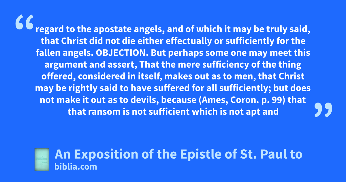 regard to the apostate angels, and of which it may be truly said, that Christ did not die either effectually or sufficiently for the fallen angels. OBJECTION. But perhaps some one may meet this argument and assert, That the mere sufficiency of the thing offered, considered in itself, makes out as to men, that Christ may be rightly said to have suffered for all sufficiently; but does not make it out as to devils, because (Ames, Coron. p. 99) that that ransom is not sufficient which is not apt and