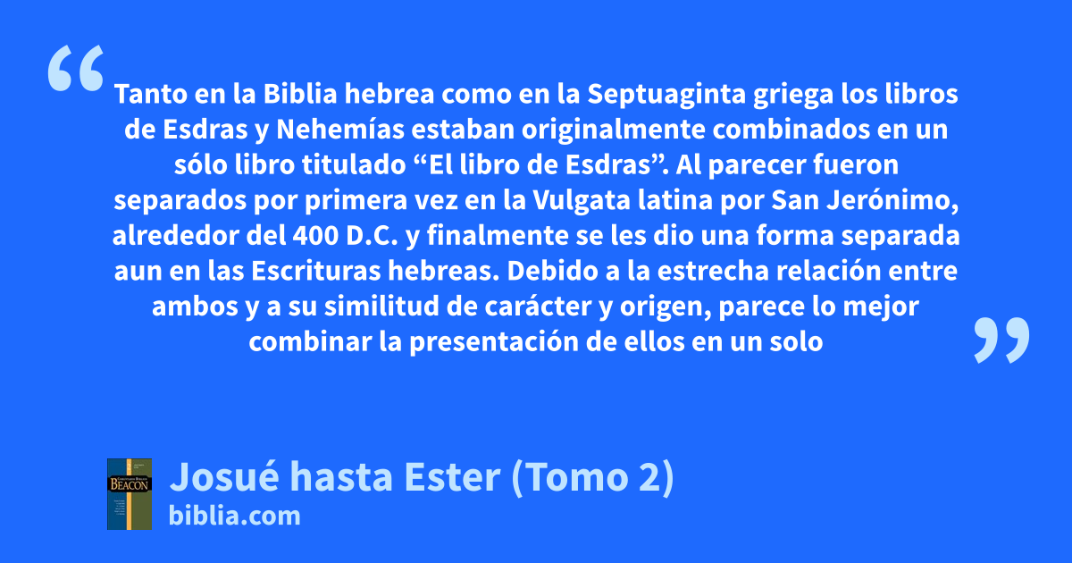 Tanto en la Biblia hebrea como en la Septuaginta griega los libros de Esdras y Nehemías estaban originalmente combinados en un sólo libro titulado “El libro de Esdras”. Al parecer fueron separados por primera vez en la Vulgata latina por San Jerónimo, alrededor del 400 D.C. y finalmente se les dio una forma separada aun en las Escrituras hebreas. Debido a la estrecha relación entre ambos y a su similitud de carácter y origen, parece lo mejor combinar la presentación de ellos en un solo