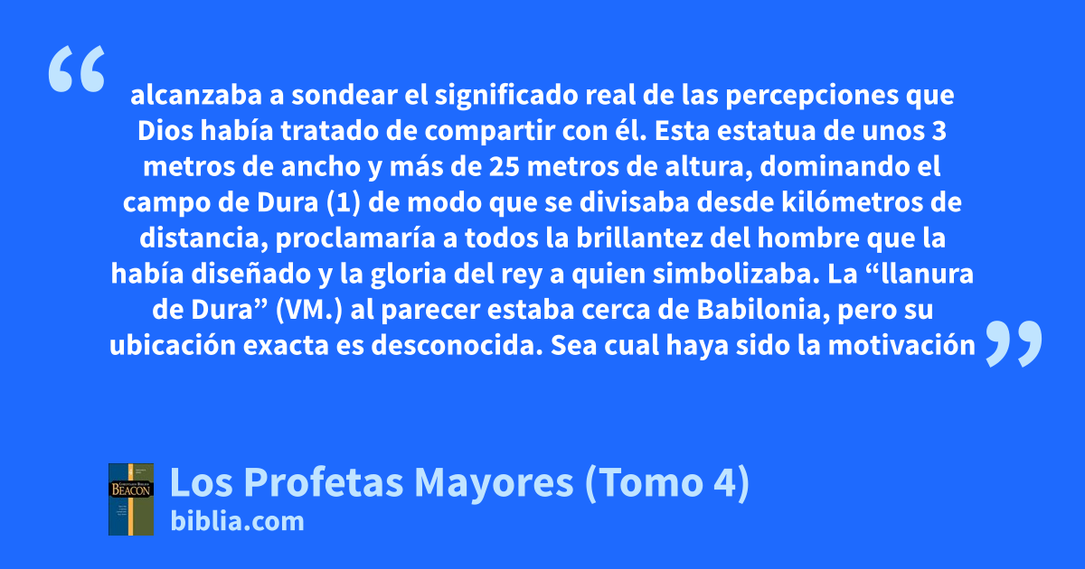 alcanzaba a sondear el significado real de las percepciones que Dios había tratado de compartir con él. Esta estatua de unos 3 metros de ancho y más de 25 metros de altura, dominando el campo de Dura (1) de modo que se divisaba desde kilómetros de distancia, proclamaría a todos la brillantez del hombre que la había diseñado y la gloria del rey a quien simbolizaba. La “llanura de Dura” (VM.) al parecer estaba cerca de Babilonia, pero su ubicación exacta es desconocida. Sea cual haya sido la motivación