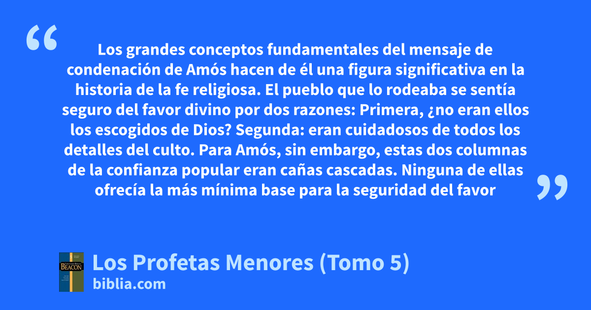 Los grandes conceptos fundamentales del mensaje de condenación de Amós hacen de él una figura significativa en la historia de la fe religiosa. El pueblo que lo rodeaba se sentía seguro del favor divino por dos razones: Primera, ¿no eran ellos los escogidos de Dios? Segunda: eran cuidadosos de todos los detalles del culto. Para Amós, sin embargo, estas dos columnas de la confianza popular eran cañas cascadas. Ninguna de ellas ofrecía la más mínima base para la seguridad del favor