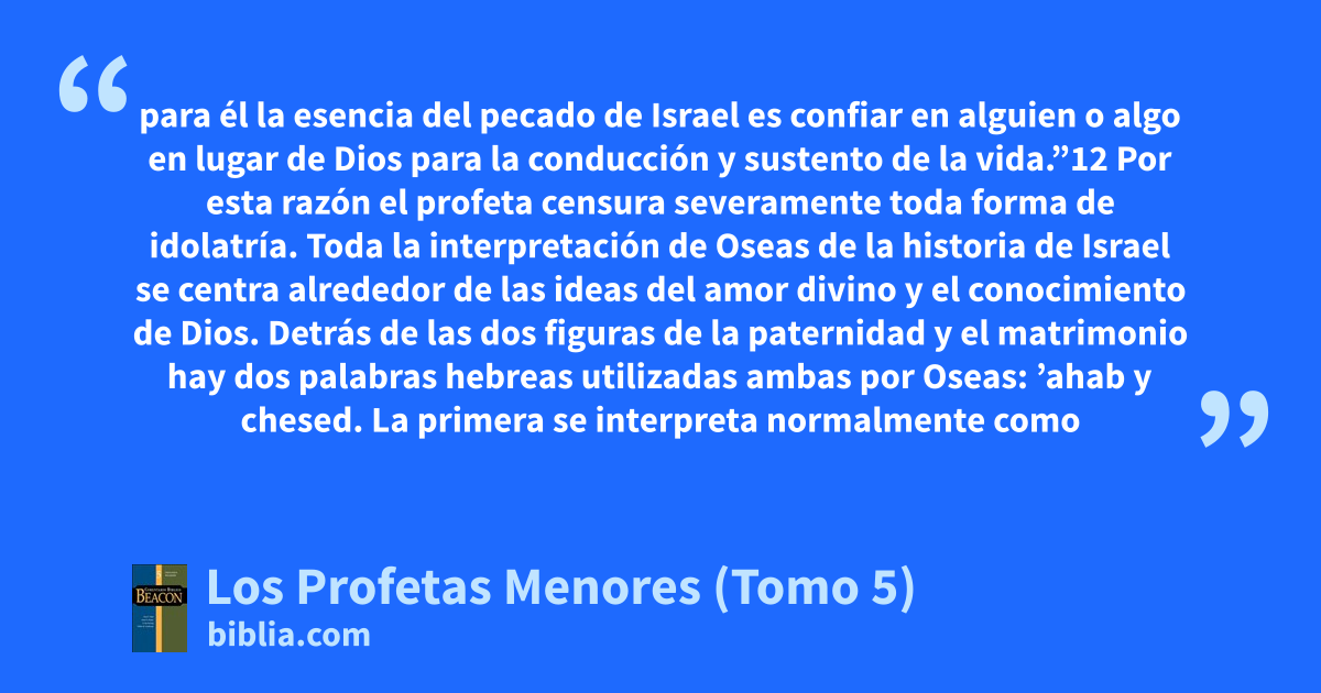 para él la esencia del pecado de Israel es confiar en alguien o algo en lugar de Dios para la conducción y sustento de la vida.”12 Por esta razón el profeta censura severamente toda forma de idolatría. Toda la interpretación de Oseas de la historia de Israel se centra alrededor de las ideas del amor divino y el conocimiento de Dios. Detrás de las dos figuras de la paternidad y el matrimonio hay dos palabras hebreas utilizadas ambas por Oseas: ’ahab y chesed. La primera se interpreta normalmente como