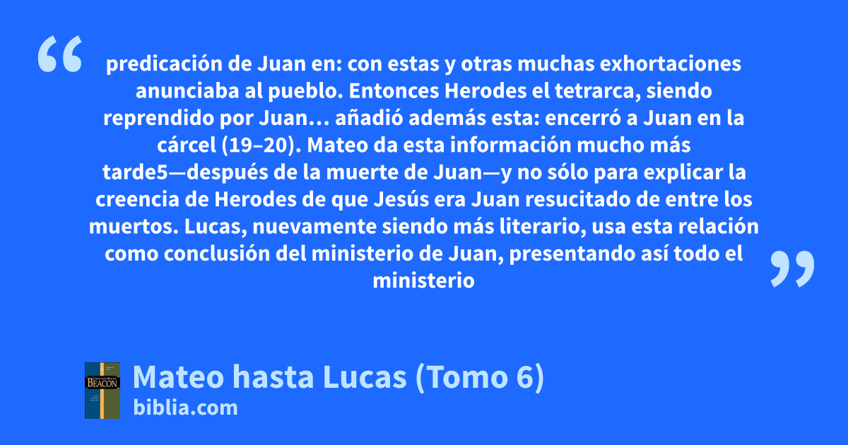 predicación de Juan en: con estas y otras muchas exhortaciones anunciaba al pueblo. Entonces Herodes el tetrarca, siendo reprendido por Juan… añadió además esta: encerró a Juan en la cárcel (19–20). Mateo da esta información mucho más tarde5—después de la muerte de Juan—y no sólo para explicar la creencia de Herodes de que Jesús era Juan resucitado de entre los muertos. Lucas, nuevamente siendo más literario, usa esta relación como conclusión del ministerio de Juan, presentando así todo el ministerio