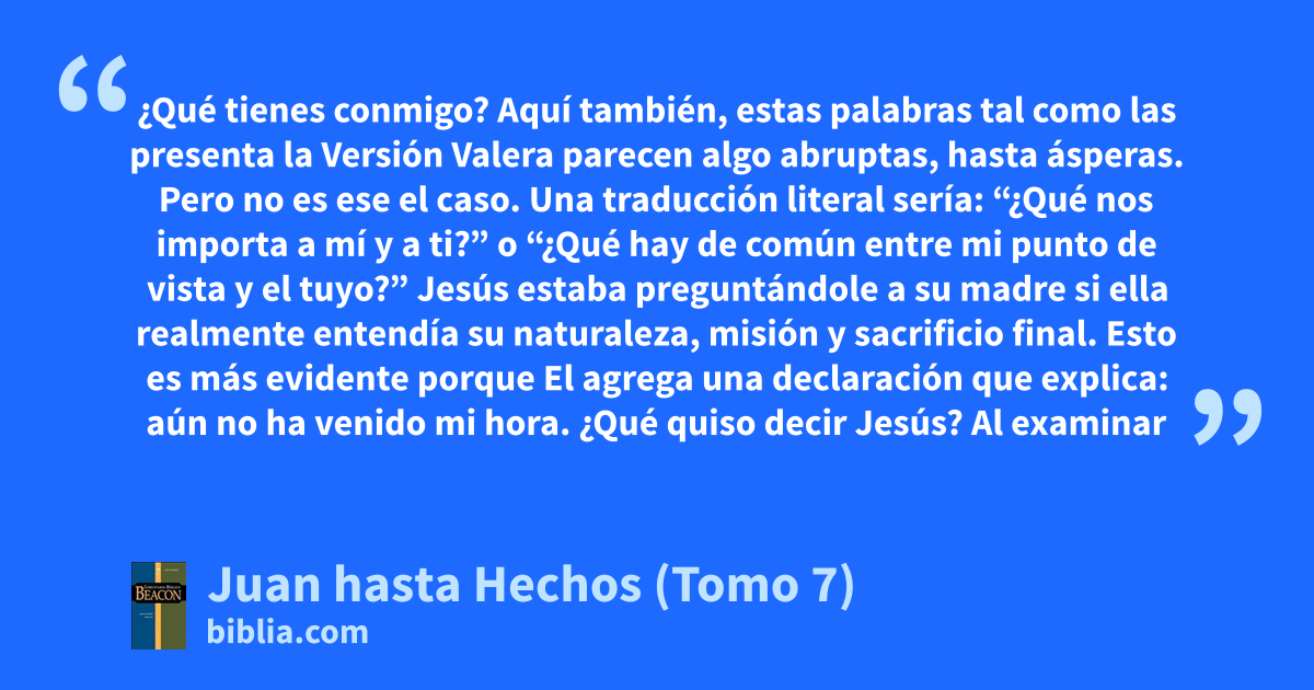 ¿Qué tienes conmigo? Aquí también, estas palabras tal como las presenta la Versión Valera parecen algo abruptas, hasta ásperas. Pero no es ese el caso. Una traducción literal sería: “¿Qué nos importa a mí y a ti?” o “¿Qué hay de común entre mi punto de vista y el tuyo?” Jesús estaba preguntándole a su madre si ella realmente entendía su naturaleza, misión y sacrificio final. Esto es más evidente porque El agrega una declaración que explica: aún no ha venido mi hora. ¿Qué quiso decir Jesús? Al examinar