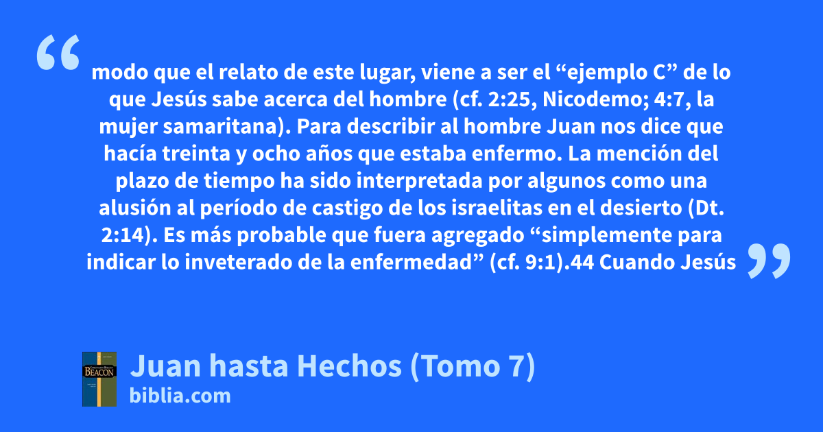 modo que el relato de este lugar, viene a ser el “ejemplo C” de lo que Jesús sabe acerca del hombre (cf. 2:25, Nicodemo; 4:7, la mujer samaritana). Para describir al hombre Juan nos dice que hacía treinta y ocho años que estaba enfermo. La mención del plazo de tiempo ha sido interpretada por algunos como una alusión al período de castigo de los israelitas en el desierto (Dt. 2:14). Es más probable que fuera agregado “simplemente para indicar lo inveterado de la enfermedad” (cf. 9:1).44 Cuando Jesús