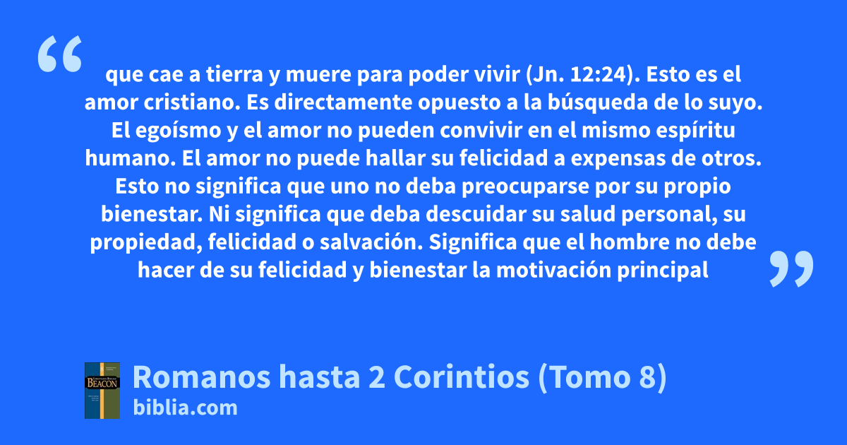 que cae a tierra y muere para poder vivir (Jn. 12:24). Esto es el amor cristiano. Es directamente opuesto a la búsqueda de lo suyo. El egoísmo y el amor no pueden convivir en el mismo espíritu humano. El amor no puede hallar su felicidad a expensas de otros. Esto no significa que uno no deba preocuparse por su propio bienestar. Ni significa que deba descuidar su salud personal, su propiedad, felicidad o salvación. Significa que el hombre no debe hacer de su felicidad y bienestar la motivación principal