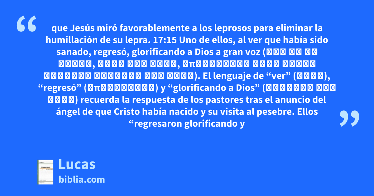 que Jesús miró favorablemente a los leprosos para eliminar la humillación de su lepra. 17:15 Uno de ellos, al ver que había sido sanado, regresó, glorificando a Dios a gran voz (εἷς δὲ ἐξ αὐτῶν, ἰδὼν ὅτι ἰάθη, ὑπέστρεψεν μετὰ φωνῆς μεγάλης δοξάζων τὸν θεόν). El lenguaje de “ver” (ἰδών), “regresó” (ὑπέστρεψεν) y “glorificando a Dios” (δοξάζων τὸν θεόν) recuerda la respuesta de los pastores tras el anuncio del ángel de que Cristo había nacido y su visita al pesebre. Ellos “regresaron glorificando y