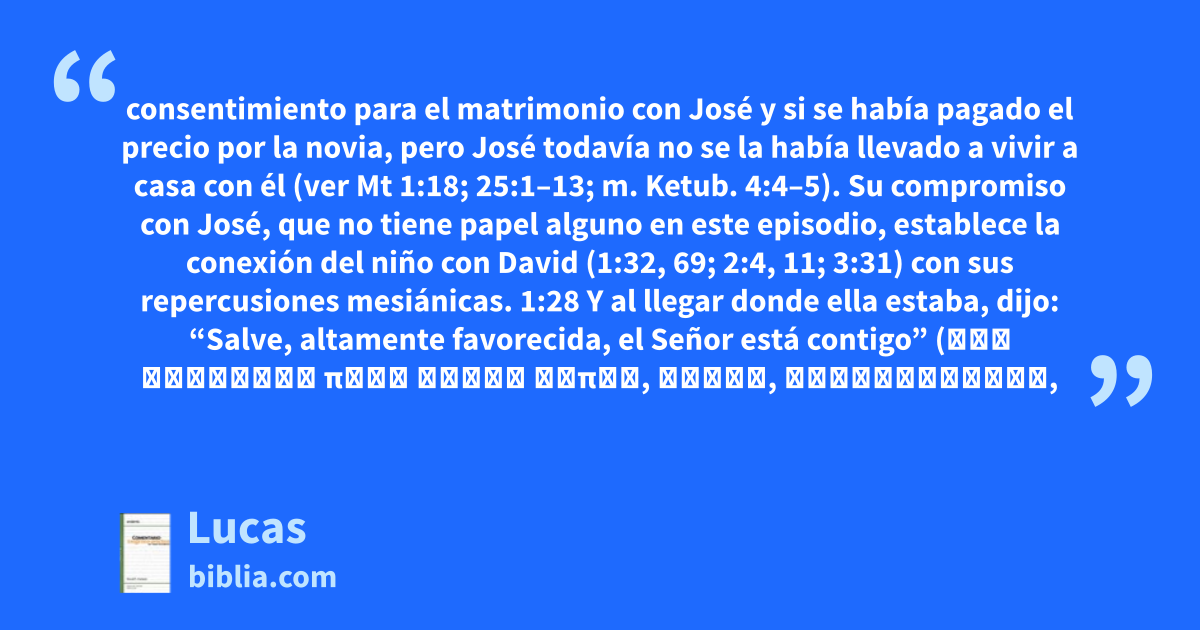 consentimiento para el matrimonio con José y si se había pagado el precio por la novia, pero José todavía no se la había llevado a vivir a casa con él (ver Mt 1:18; 25:1–13; m. Ketub. 4:4–5). Su compromiso con José, que no tiene papel alguno en este episodio, establece la conexión del niño con David (1:32, 69; 2:4, 11; 3:31) con sus repercusiones mesiánicas. 1:28 Y al llegar donde ella estaba, dijo: “Salve, altamente favorecida, el Señor está contigo” (καὶ εἰσελθὼν πρὸς αὐτὴν εἶπεν, Χαῖρε, κεχαριτωμένη,