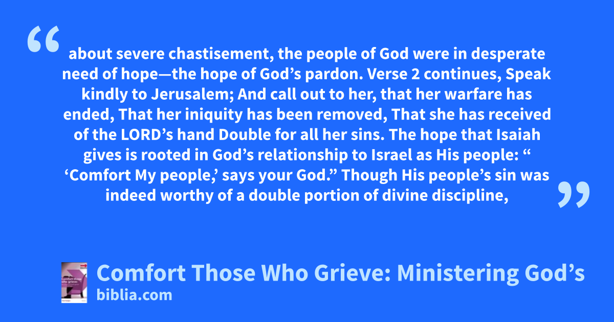 about severe chastisement, the people of God were in desperate need of hope—the hope of God’s pardon. Verse 2 continues, Speak kindly to Jerusalem; And call out to her, that her warfare has ended, That her iniquity has been removed, That she has received of the LORD’s hand Double for all her sins. The hope that Isaiah gives is rooted in God’s relationship to Israel as His people: “ ‘Comfort My people,’ says your God.” Though His people’s sin was indeed worthy of a double portion of divine discipline,