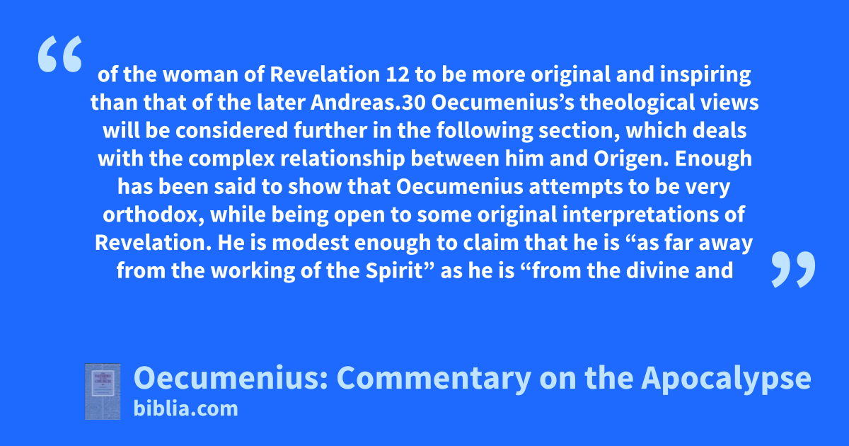 of the woman of Revelation 12 to be more original and inspiring than that of the later Andreas.30 Oecumenius’s theological views will be considered further in the following section, which deals with the complex relationship between him and Origen. Enough has been said to show that Oecumenius attempts to be very orthodox, while being open to some original interpretations of Revelation. He is modest enough to claim that he is “as far away from the working of the Spirit” as he is “from the divine and