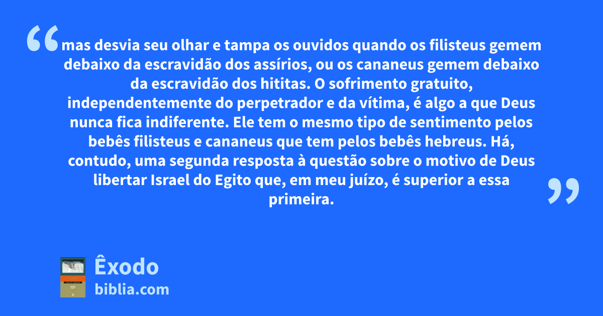 mas desvia seu olhar e tampa os ouvidos quando os filisteus gemem debaixo da escravidão dos assírios, ou os cananeus gemem debaixo da escravidão dos hititas. O sofrimento gratuito, independentemente do perpetrador e da vítima, é algo a que Deus nunca fica indiferente. Ele tem o mesmo tipo de sentimento pelos bebês filisteus e cananeus que tem pelos bebês hebreus. Há, contudo, uma segunda resposta à questão sobre o motivo de Deus libertar Israel do Egito que, em meu juízo, é superior a essa primeira.