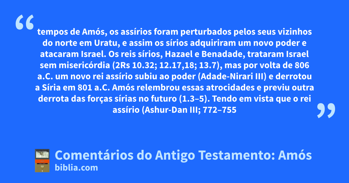tempos de Amós, os assírios foram perturbados pelos seus vizinhos do norte em Uratu, e assim os sírios adquiriram um novo poder e atacaram Israel. Os reis sírios, Hazael e Benadade, trataram Israel sem misericórdia (2Rs 10.32; 12.17,18; 13.7), mas por volta de 806 a.C. um novo rei assírio subiu ao poder (Adade-Nirari III) e derrotou a Síria em 801 a.C. Amós relembrou essas atrocidades e previu outra derrota das forças sírias no futuro (1.3–5). Tendo em vista que o rei assírio (Ashur-Dan III; 772–755