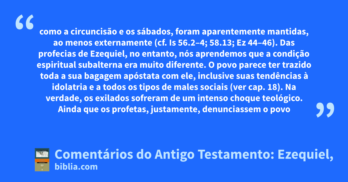 como a circuncisão e os sábados, foram aparentemente mantidas, ao menos externamente (cf. Is 56.2–4; 58.13; Ez 44–46). Das profecias de Ezequiel, no entanto, nós aprendemos que a condição espiritual subalterna era muito diferente. O povo parece ter trazido toda a sua bagagem apóstata com ele, inclusive suas tendências à idolatria e a todos os tipos de males sociais (ver cap. 18). Na verdade, os exilados sofreram de um intenso choque teológico. Ainda que os profetas, justamente, denunciassem o povo