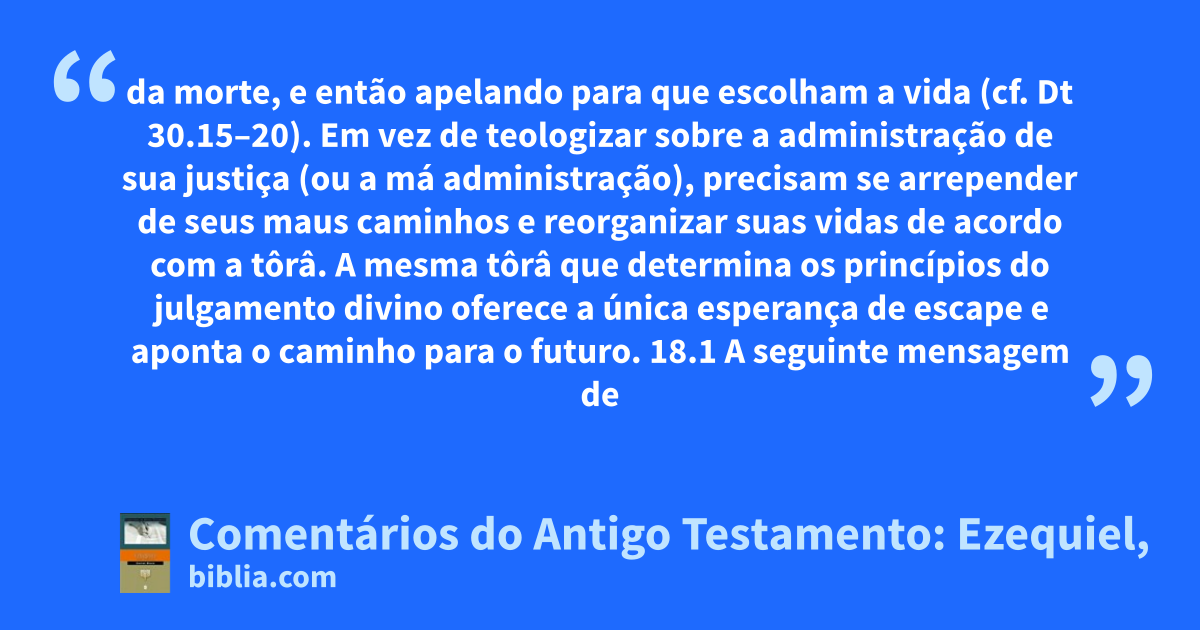 da morte, e então apelando para que escolham a vida (cf. Dt 30.15–20). Em vez de teologizar sobre a administração de sua justiça (ou a má administração), precisam se arrepender de seus maus caminhos e reorganizar suas vidas de acordo com a tôrâ. A mesma tôrâ que determina os princípios do julgamento divino oferece a única esperança de escape e aponta o caminho para o futuro. 18.1 A seguinte mensagem de