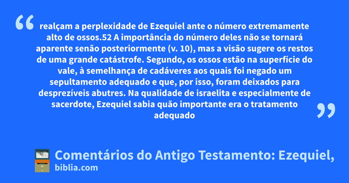 realçam a perplexidade de Ezequiel ante o número extremamente alto de ossos.52 A importância do número deles não se tornará aparente senão posteriormente (v. 10), mas a visão sugere os restos de uma grande catástrofe. Segundo, os ossos estão na superfície do vale, à semelhança de cadáveres aos quais foi negado um sepultamento adequado e que, por isso, foram deixados para desprezíveis abutres. Na qualidade de israelita e especialmente de sacerdote, Ezequiel sabia quão importante era o tratamento adequado