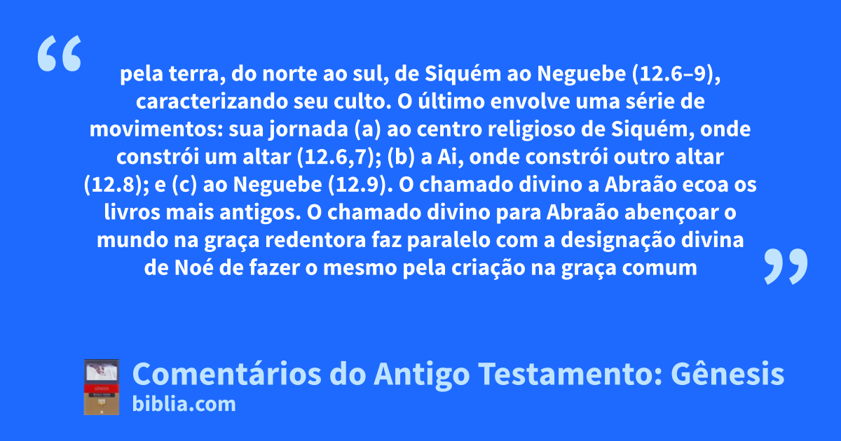 pela terra, do norte ao sul, de Siquém ao Neguebe (12.6–9), caracterizando seu culto. O último envolve uma série de movimentos: sua jornada (a) ao centro religioso de Siquém, onde constrói um altar (12.6,7); (b) a Ai, onde constrói outro altar (12.8); e (c) ao Neguebe (12.9). O chamado divino a Abraão ecoa os livros mais antigos. O chamado divino para Abraão abençoar o mundo na graça redentora faz paralelo com a designação divina de Noé de fazer o mesmo pela criação na graça comum