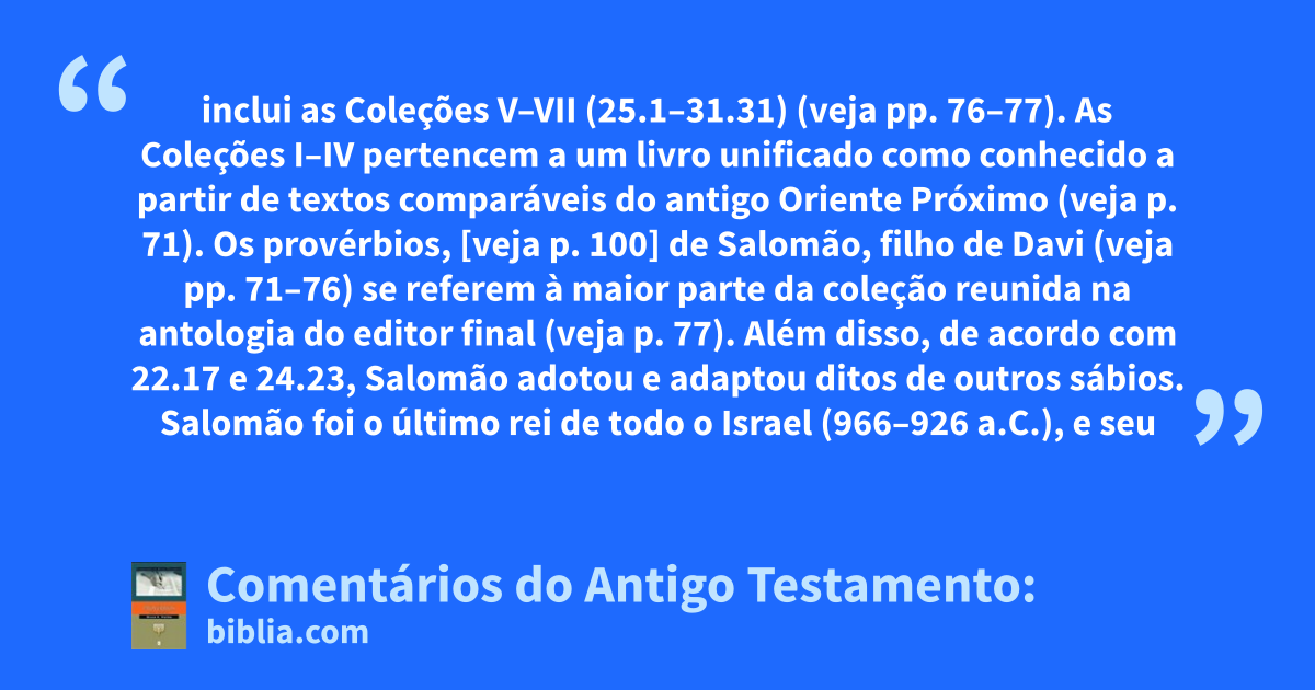 inclui as Coleções V–VII (25.1–31.31) (veja pp. 76–77). As Coleções I–IV pertencem a um livro unificado como conhecido a partir de textos comparáveis do antigo Oriente Próximo (veja p. 71). Os provérbios, [veja p. 100] de Salomão, filho de Davi (veja pp. 71–76) se referem à maior parte da coleção reunida na antologia do editor final (veja p. 77). Além disso, de acordo com 22.17 e 24.23, Salomão adotou e adaptou ditos de outros sábios. Salomão foi o último rei de todo o Israel (966–926 a.C.), e seu