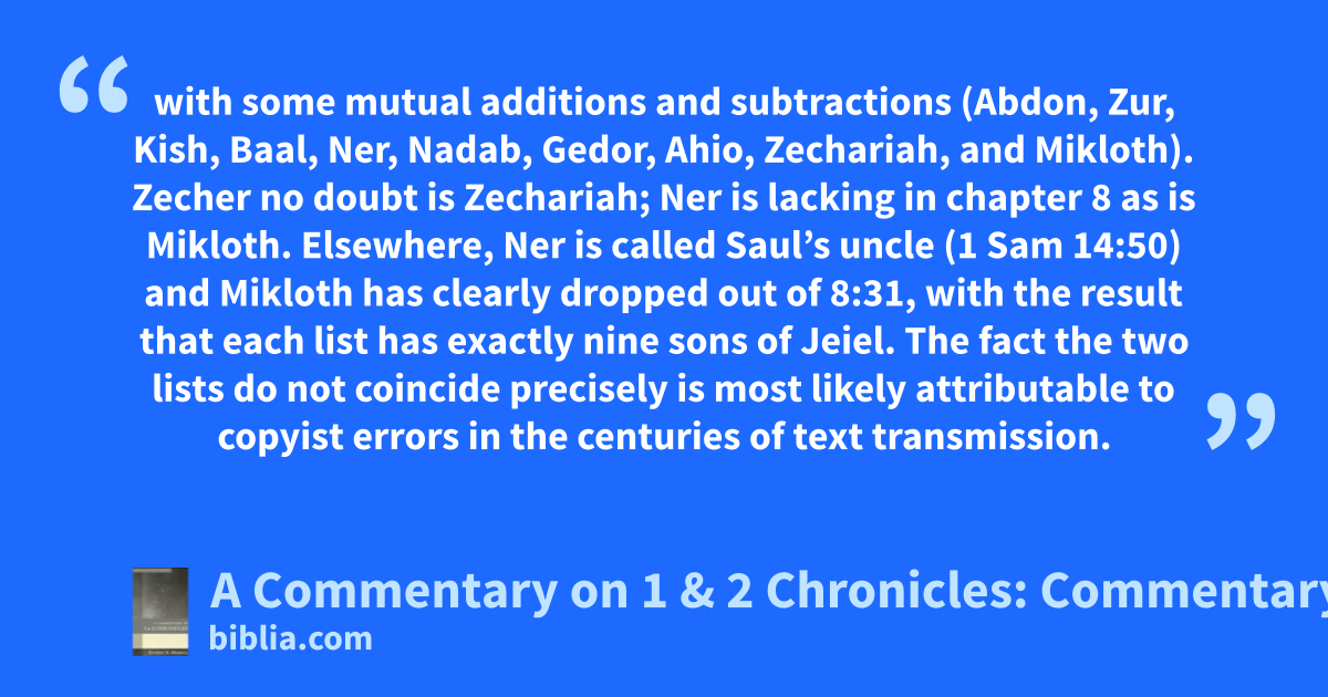 with some mutual additions and subtractions (Abdon, Zur, Kish, Baal, Ner, Nadab, Gedor, Ahio, Zechariah, and Mikloth). Zecher no doubt is Zechariah; Ner is lacking in chapter 8 as is Mikloth. Elsewhere, Ner is called Saul’s uncle (1 Sam 14:50) and Mikloth has clearly dropped out of 8:31, with the result that each list has exactly nine sons of Jeiel. The fact the two lists do not coincide precisely is most likely attributable to copyist errors in the centuries of text transmission.