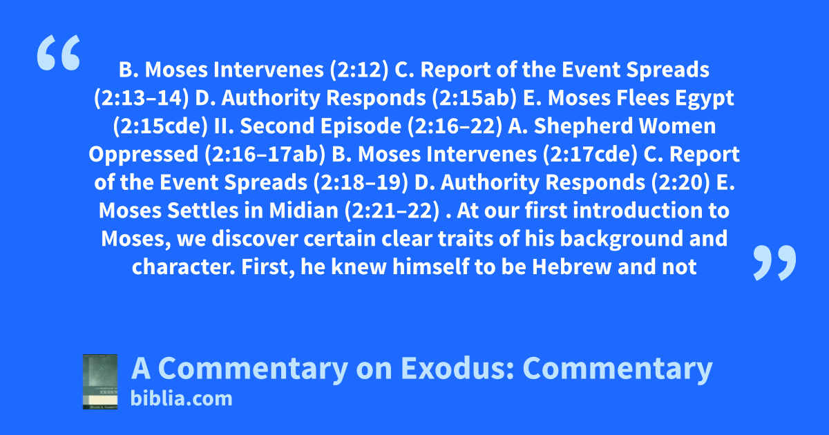B. Moses Intervenes (2:12) C. Report of the Event Spreads (2:13–14) D. Authority Responds (2:15ab) E. Moses Flees Egypt (2:15cde) II. Second Episode (2:16–22) A. Shepherd Women Oppressed (2:16–17ab) B. Moses Intervenes (2:17cde) C. Report of the Event Spreads (2:18–19) D. Authority Responds (2:20) E. Moses Settles in Midian (2:21–22) . At our first introduction to Moses, we discover certain clear traits of his background and character. First, he knew himself to be Hebrew and not