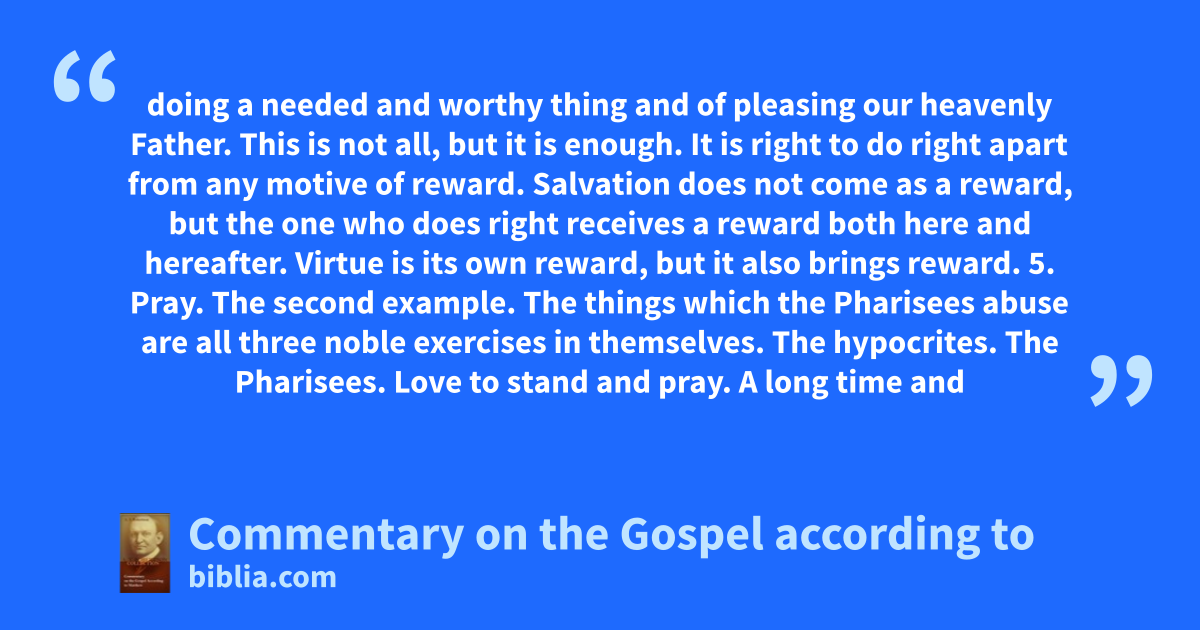doing a needed and worthy thing and of pleasing our heavenly Father. This is not all, but it is enough. It is right to do right apart from any motive of reward. Salvation does not come as a reward, but the one who does right receives a reward both here and hereafter. Virtue is its own reward, but it also brings reward. 5. Pray. The second example. The things which the Pharisees abuse are all three noble exercises in themselves. The hypocrites. The Pharisees. Love to stand and pray. A long time and