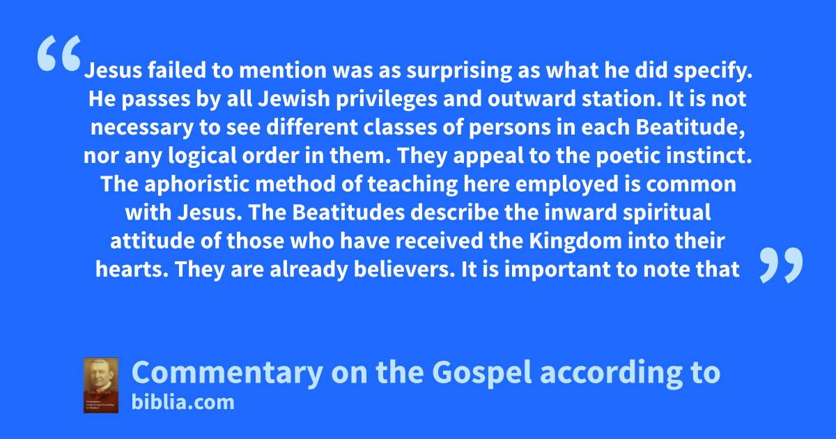 Jesus failed to mention was as surprising as what he did specify. He passes by all Jewish privileges and outward station. It is not necessary to see different classes of persons in each Beatitude, nor any logical order in them. They appeal to the poetic instinct. The aphoristic method of teaching here employed is common with Jesus. The Beatitudes describe the inward spiritual attitude of those who have received the Kingdom into their hearts. They are already believers. It is important to note that
