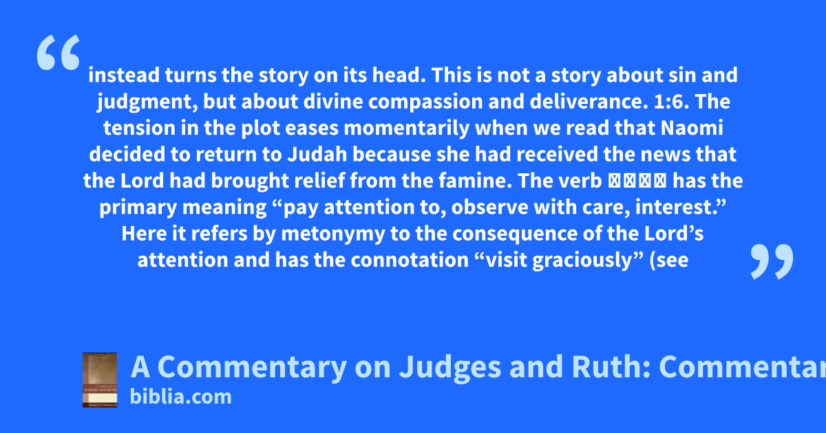 instead turns the story on its head. This is not a story about sin and judgment, but about divine compassion and deliverance. 1:6. The tension in the plot eases momentarily when we read that Naomi decided to return to Judah because she had received the news that the Lord had brought relief from the famine. The verb פּקד has the primary meaning “pay attention to, observe with care, interest.” Here it refers by metonymy to the consequence of the Lord’s attention and has the connotation “visit graciously” (see