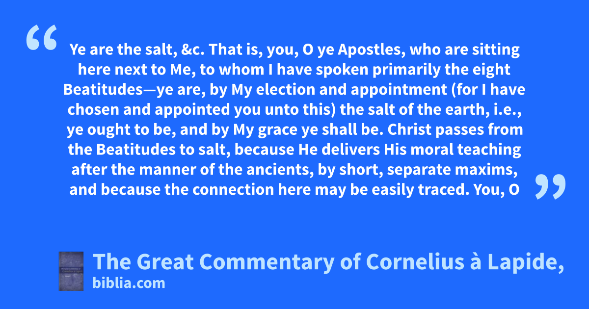 Ye are the salt, &c. That is, you, O ye Apostles, who are sitting here next to Me, to whom I have spoken primarily the eight Beatitudes—ye are, by My election and appointment (for I have chosen and appointed you unto this) the salt of the earth, i.e., ye ought to be, and by My grace ye shall be. Christ passes from the Beatitudes to salt, because He delivers His moral teaching after the manner of the ancients, by short, separate maxims, and because the connection here may be easily traced. You, O