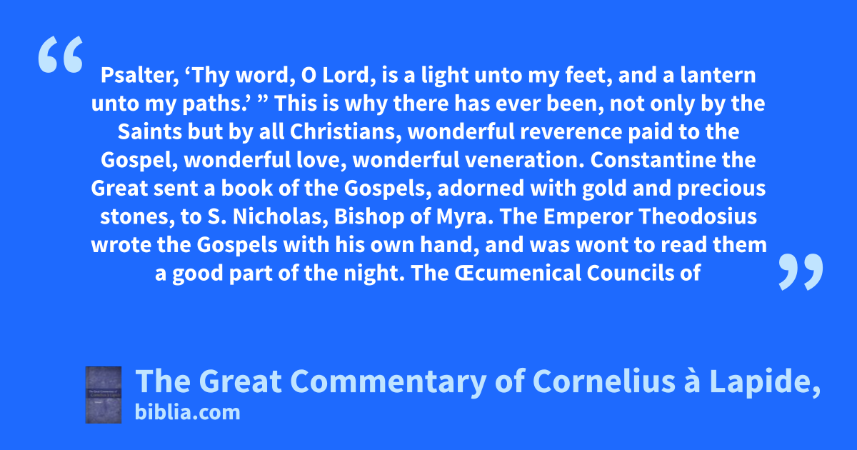 Psalter, ‘Thy word, O Lord, is a light unto my feet, and a lantern unto my paths.’ ” This is why there has ever been, not only by the Saints but by all Christians, wonderful reverence paid to the Gospel, wonderful love, wonderful veneration. Constantine the Great sent a book of the Gospels, adorned with gold and precious stones, to S. Nicholas, Bishop of Myra. The Emperor Theodosius wrote the Gospels with his own hand, and was wont to read them a good part of the night. The Œcumenical Councils of