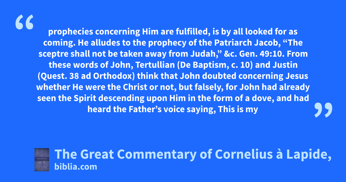 prophecies concerning Him are fulfilled, is by all looked for as coming. He alludes to the prophecy of the Patriarch Jacob, “The sceptre shall not be taken away from Judah,” &c. Gen. 49:10. From these words of John, Tertullian (De Baptism, c. 10) and Justin (Quest. 38 ad Orthodox) think that John doubted concerning Jesus whether He were the Christ or not, but falsely, for John had already seen the Spirit descending upon Him in the form of a dove, and had heard the Father’s voice saying, This is my